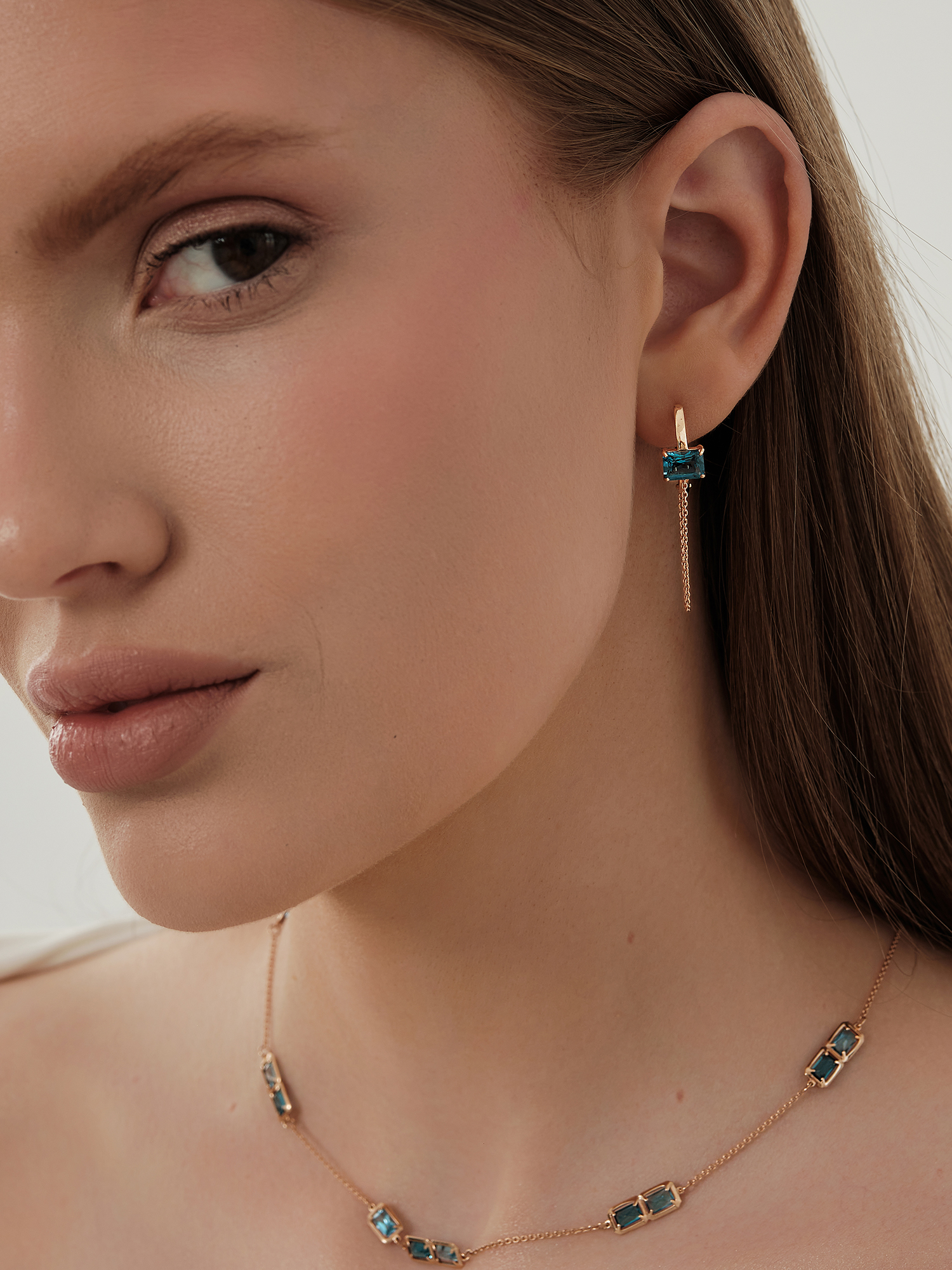 Серьги-конго выполнены из золота и имеют очень креативный дизайн. Зеленовато-синий топаз-Лондон солирует во всей композиции. Наденьте это ювелирное украшение и будьте в центре внимания!