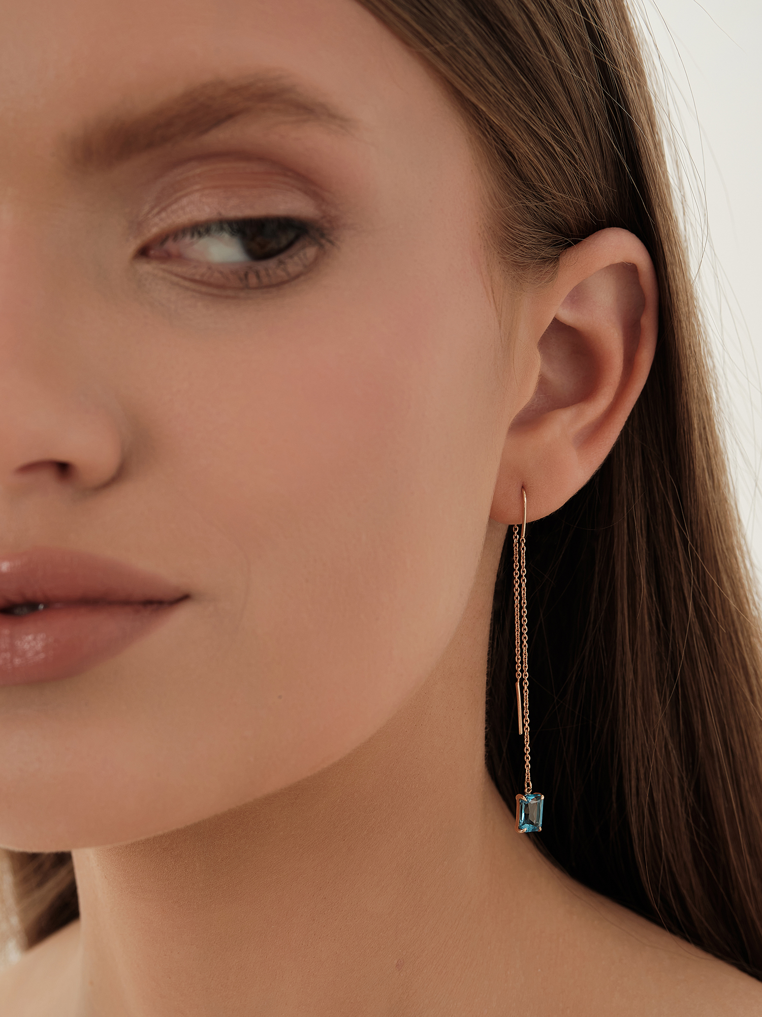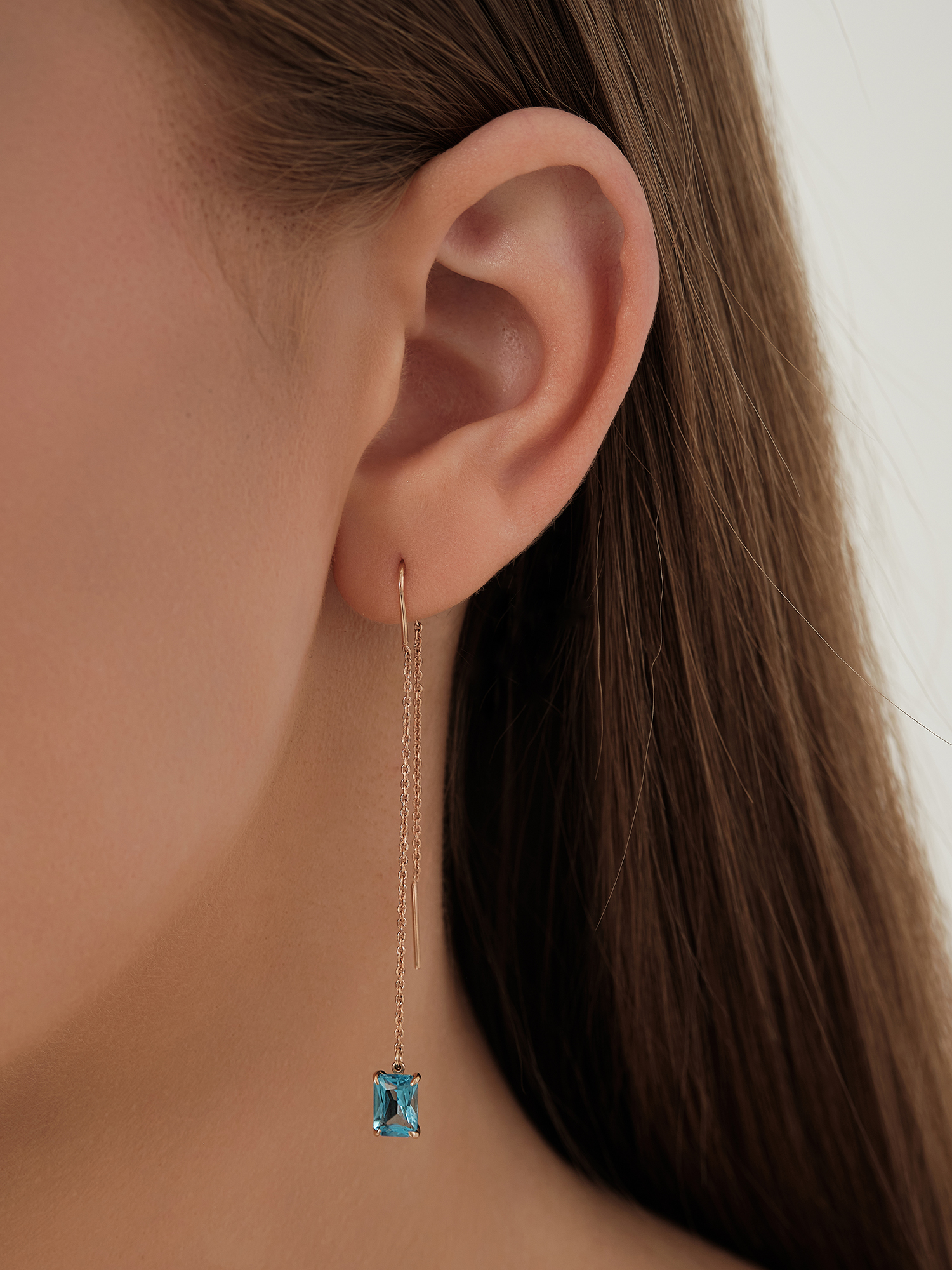 Искрящееся золото и прохладная голубизна топаза в самой интригующей форме серёг – протяжках. Такая модель визуально удлинит шею, придаст дополнительный шарм представительницам прекрасного пола!