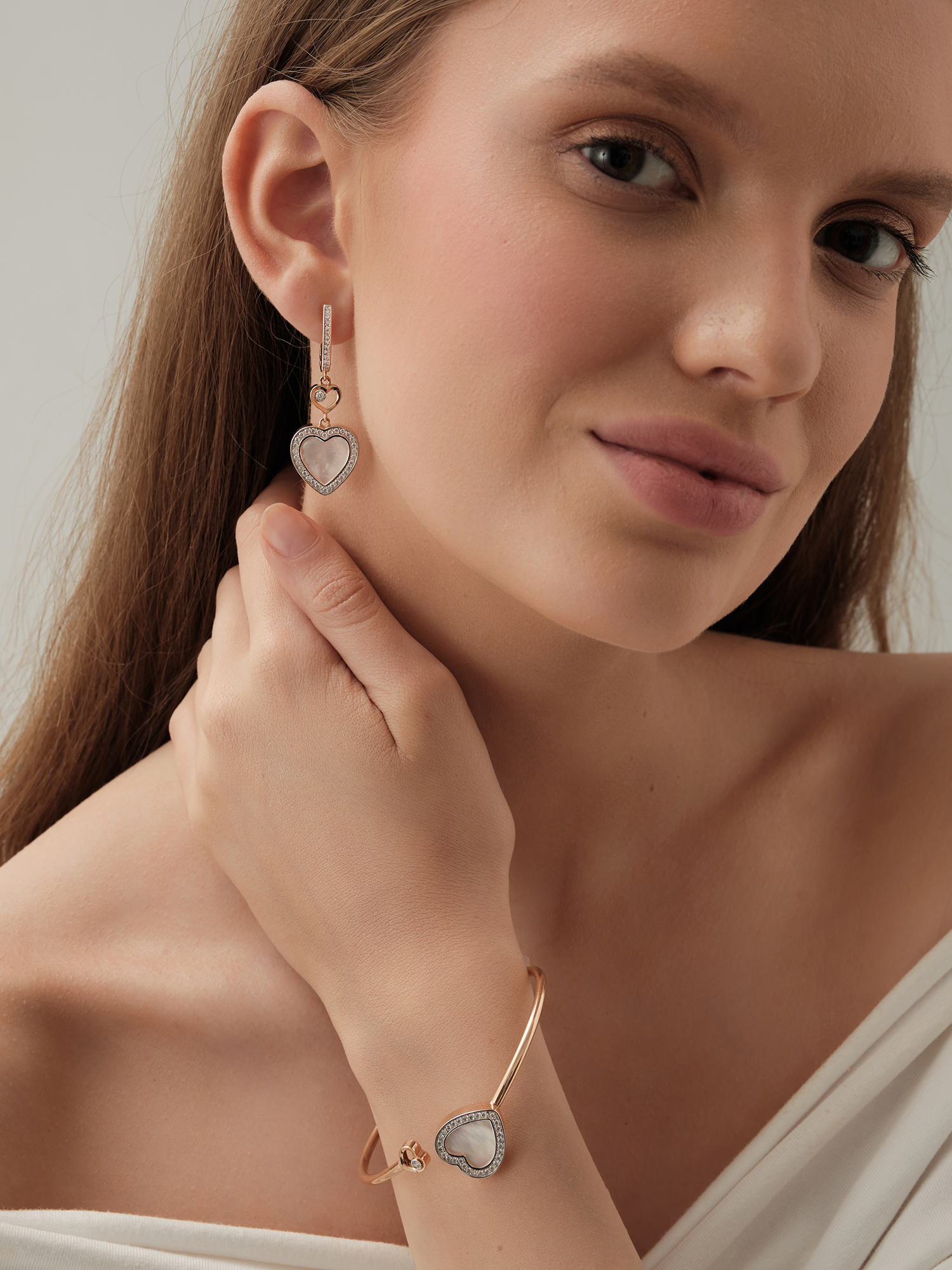 Жесткий браслет из золота 585 пробы с перламутром и фианитами