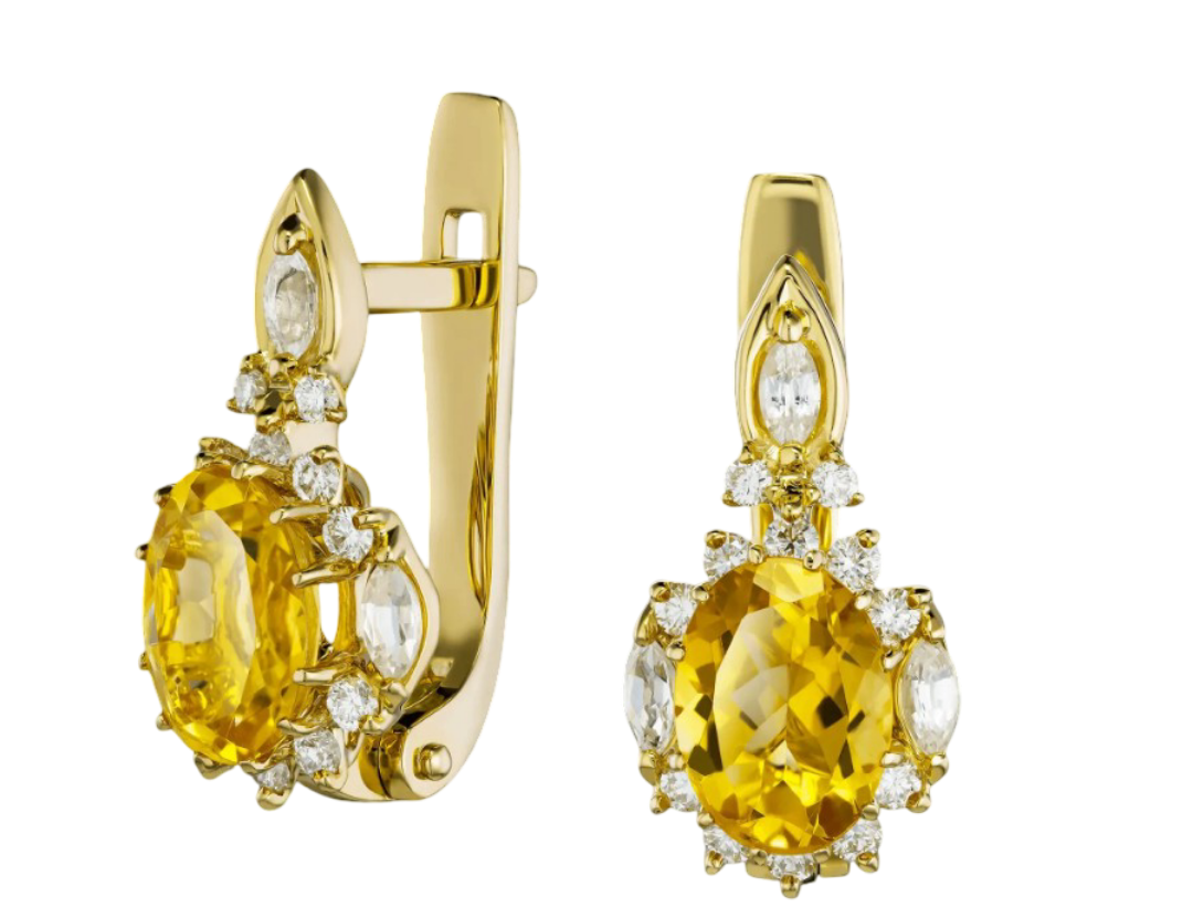 Серьги (585 ж) цитрин, сапфир белый, бриллиант