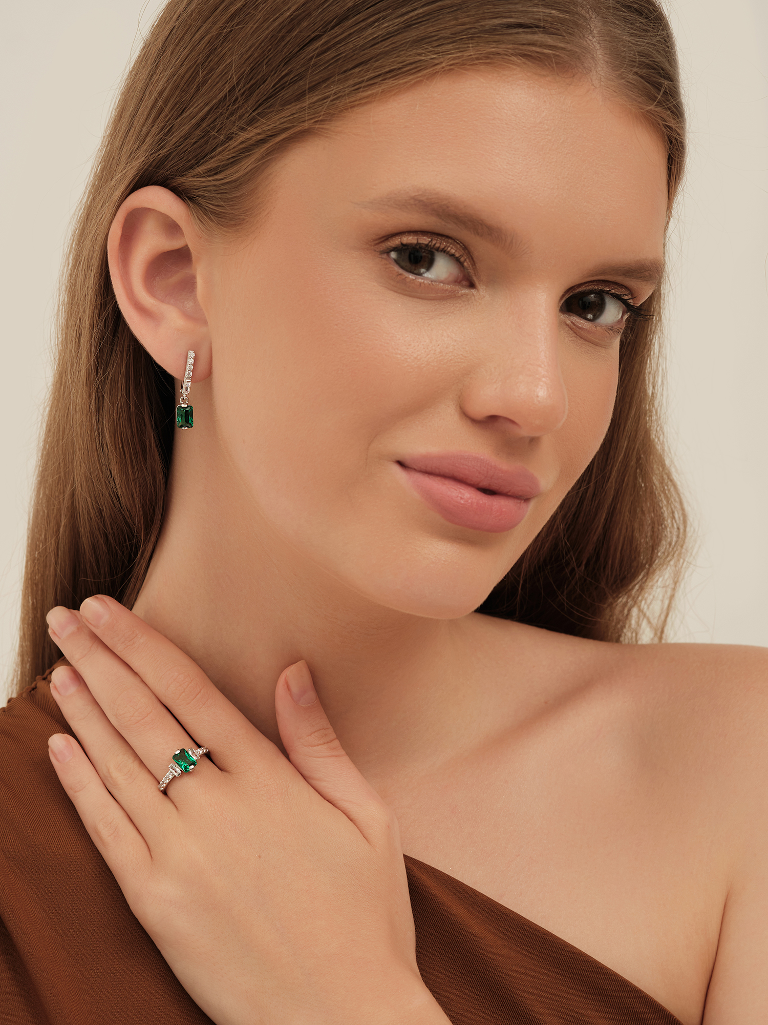 Серьги из серебра 925 пробы с искусственным изумрудом и фианитами