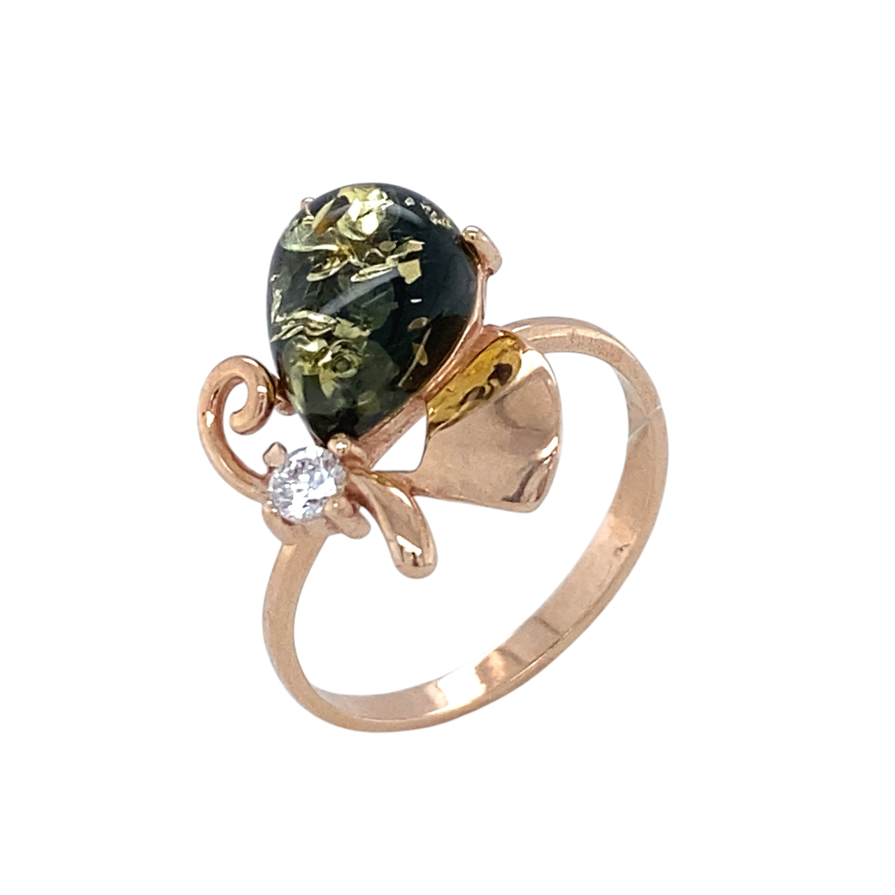 Кольцо (925 п) янтарь зеленый, фианит
