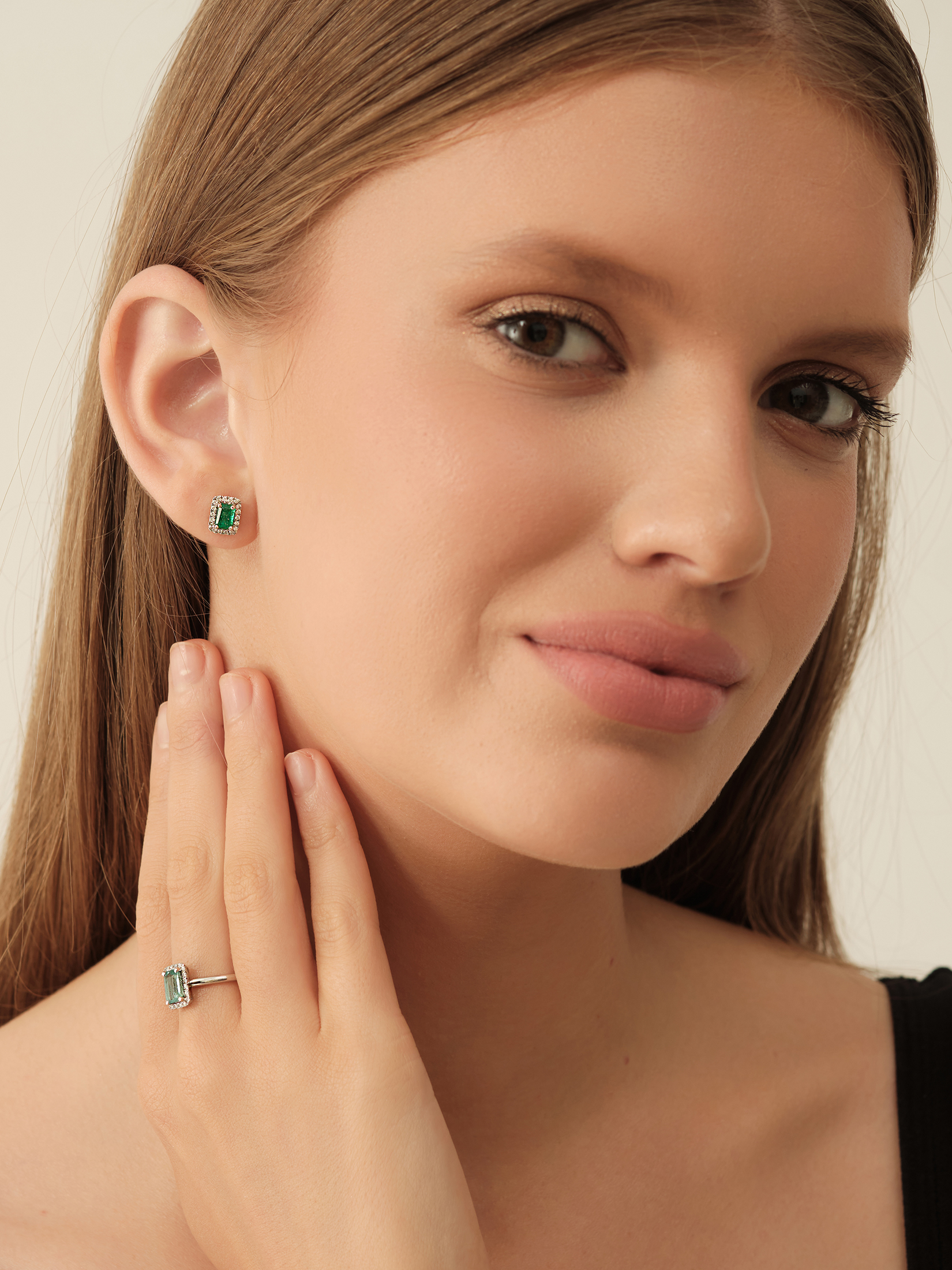 Серьги пусеты из белого золота 585 пробы с изумрудом и бриллиантом