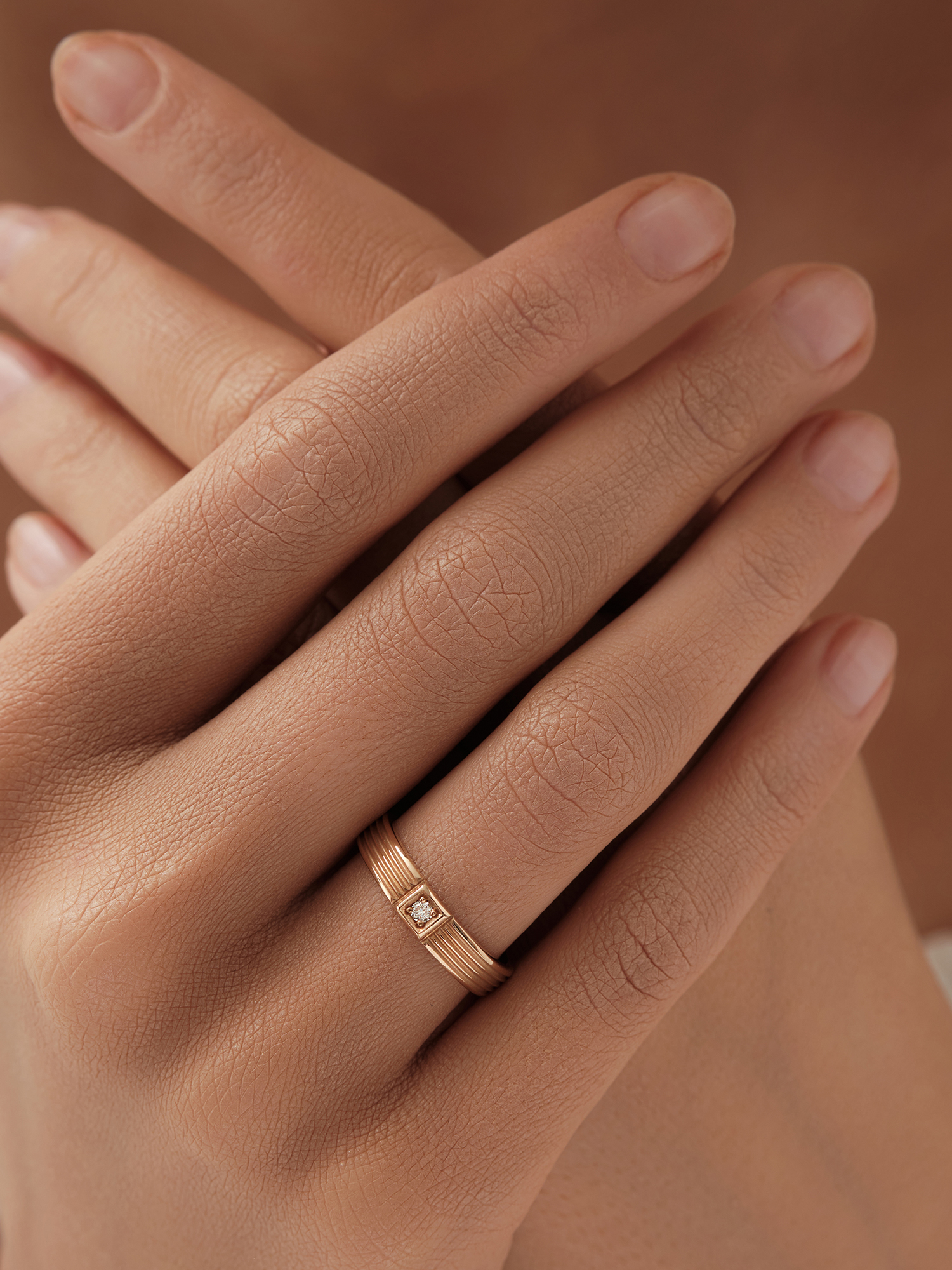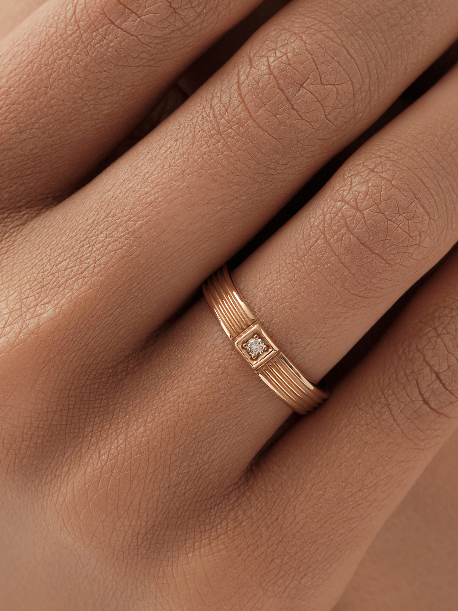 Строгий геометрический рисунок кольцу из классического розового золота придают полосы, нанесенные рукой талантливого ювелира. Бриллиант венчает изысканный минимализм модели!