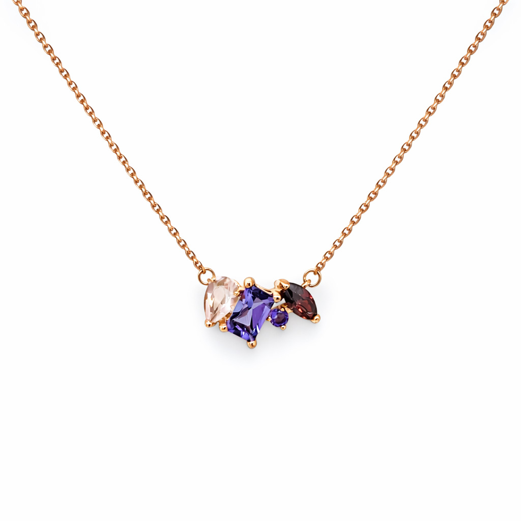 Колье (585) кварц, аметист, родолит синт.