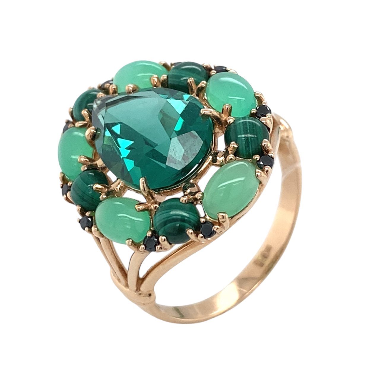Кольцо (585) кварц зеленый, малахит, хризопраз, цветной фианит