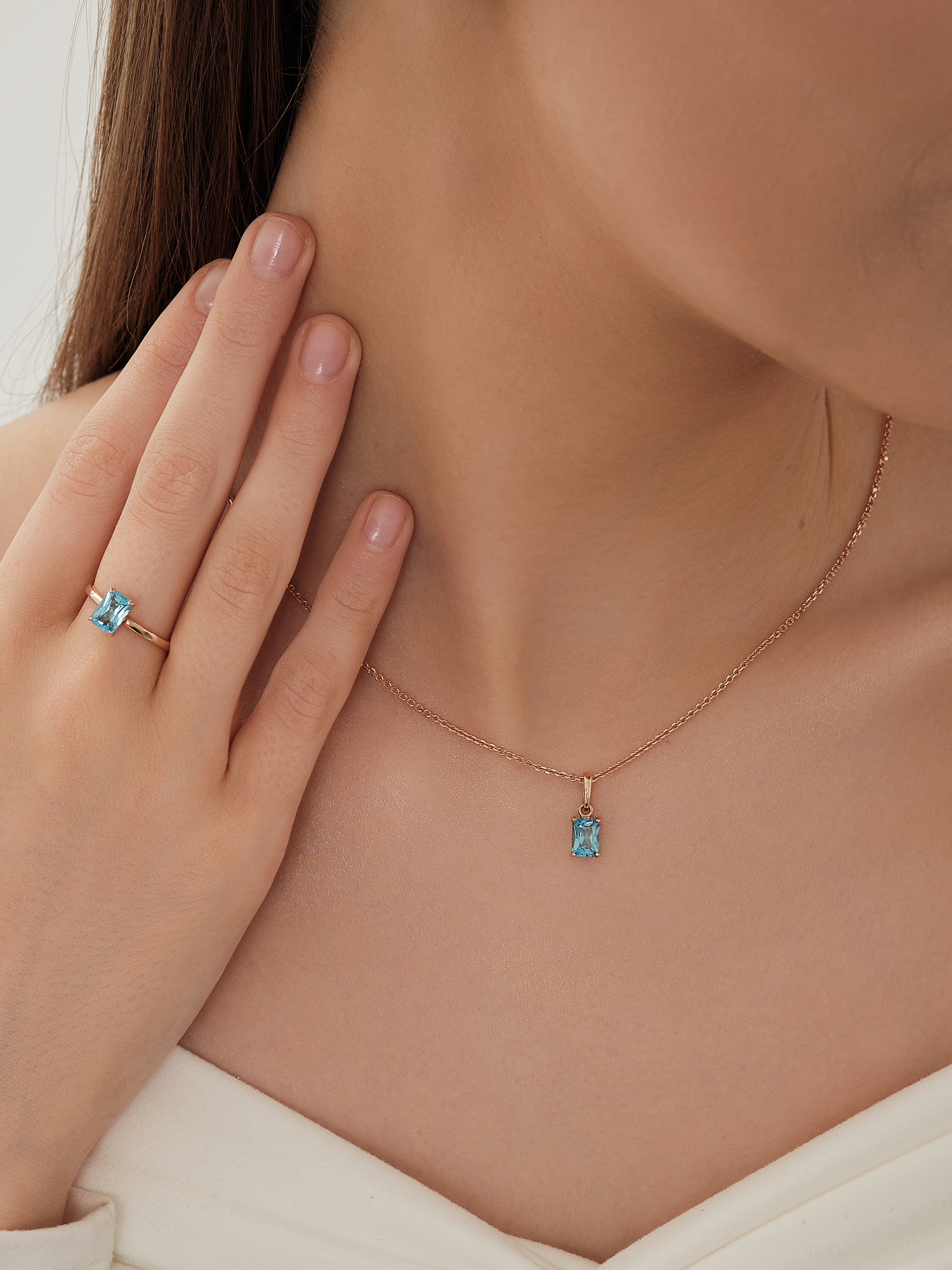 Подвеска из золота 585 пробы со вставкой из голубого топаза в огранке октагон придаст свежести Вашему образу и будет сочетается с любыми украшениями Amalfi, навевая воспоминания об игривых морских волнах и тёплых деньках, проведённых под лучистым солнцем.