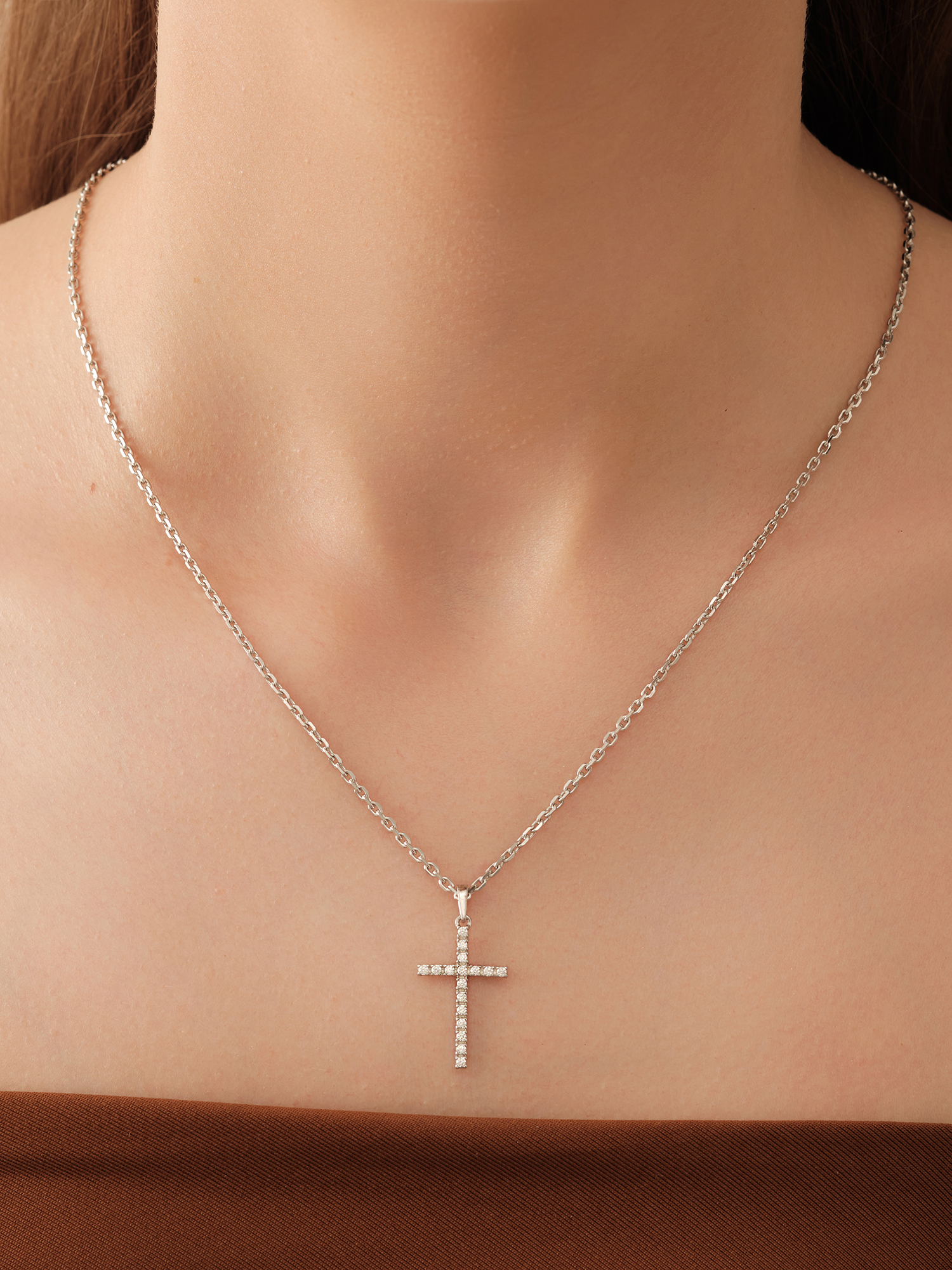 Серебряный декоративный крест, инкрустированный сверкающими фианитами, придаст образу шик и блеск. Такой аксессуар отлично выглядит как в повседневных образах, так и в вечерних.