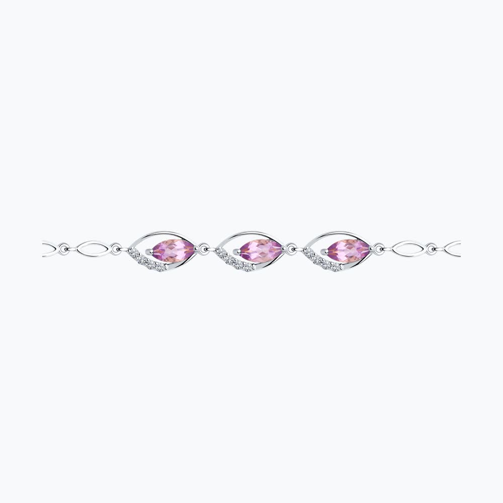 Серебряный браслет классического дизайна с аметистами редкой формы Маркиз. Деликатные звенья серебра в сочетании с фианитами обрамляют самоцветы, образуя чудесное женственное украшение. Аметист - символ честности, неподкупности и верности.