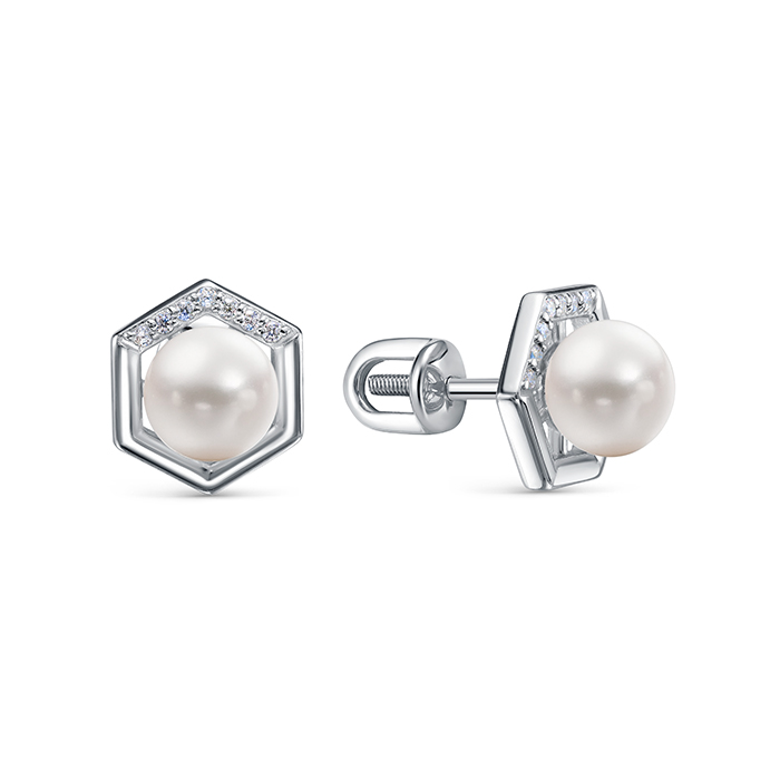 Серьги пусеты из серебра 925 пробы с жемчугом и фианитами