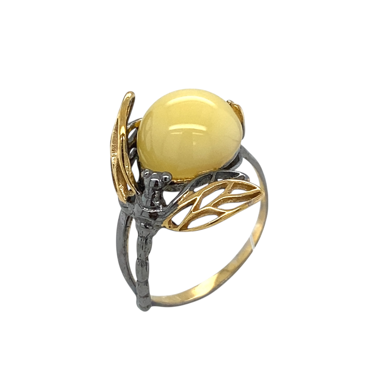 Кольцо из серебра 925 пробы с позолотой, с белым янтарем