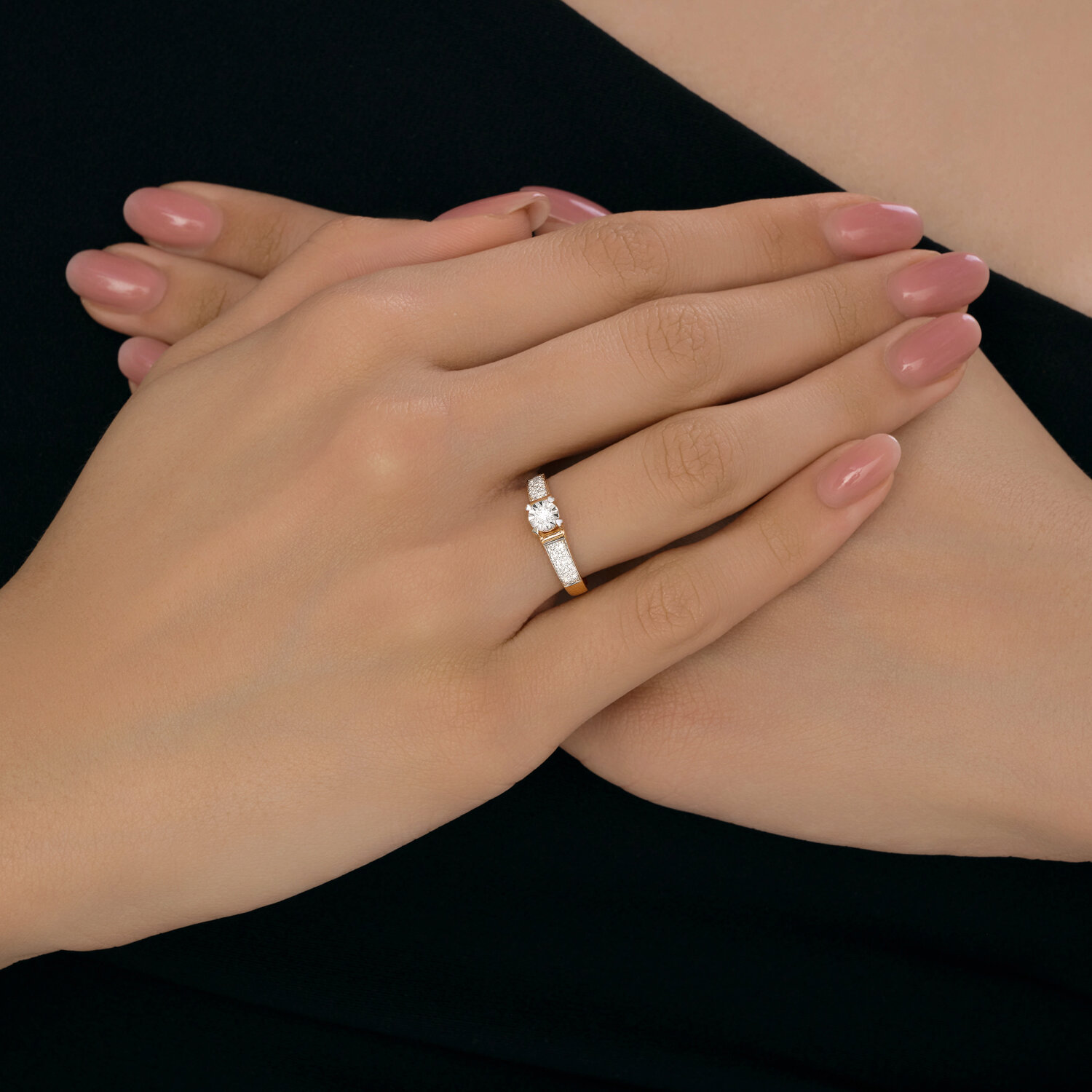 Смотреть на это украшение - одно наслаждение. Крупный бриллиант посередине кольца притягивает все наше внимание, а по бокам россыпь из небольших бриллиантов и все это в золотой оправе. Кольцо будет чудесным подарком для любой девушки!
