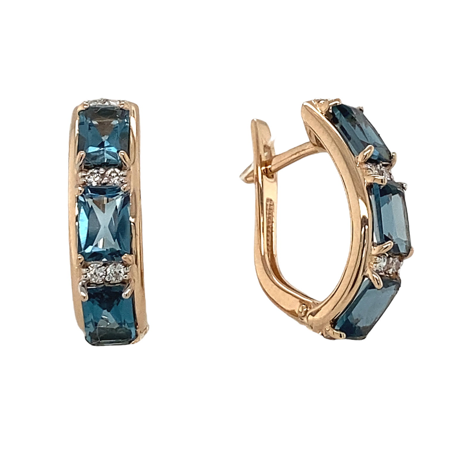 Серьги из золота 585 пробы с топазом London Blue и фианитами