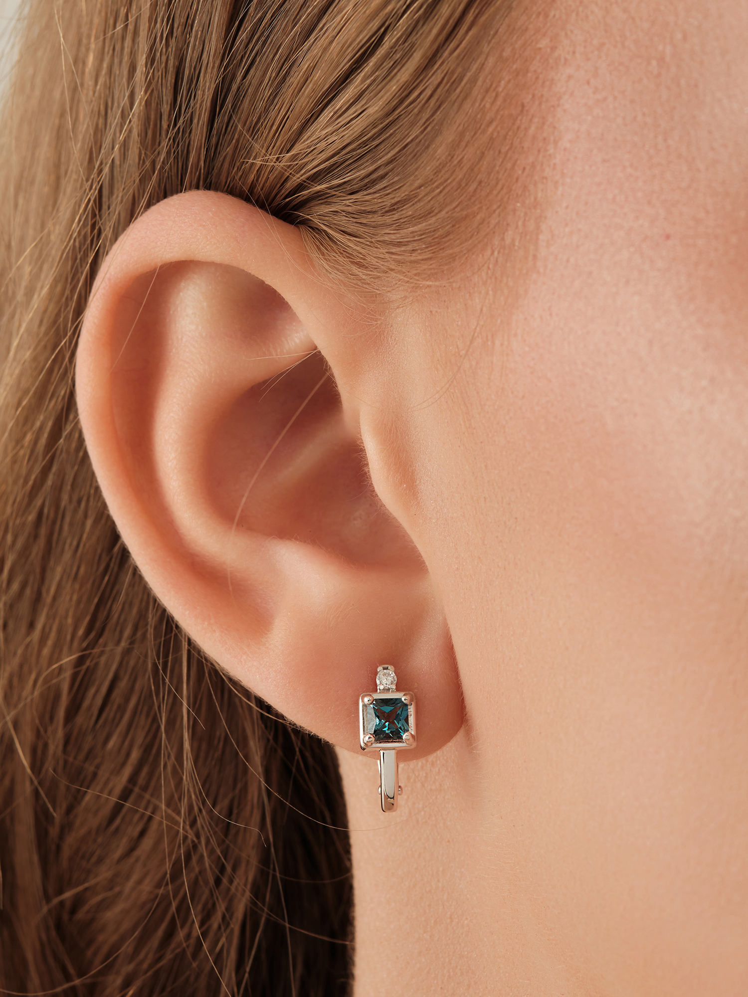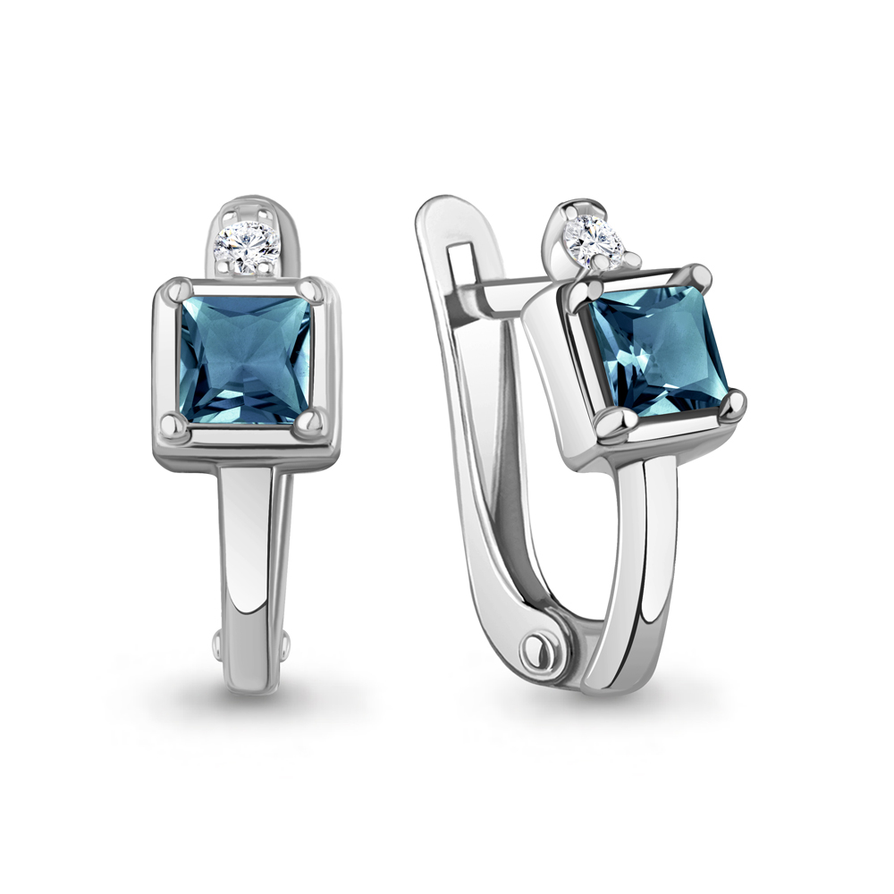 Серьги из белого золота 585 пробы с топазом London Blue и фианитами