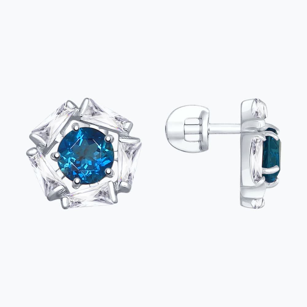 Серьги пусеты из серебра 925 пробы с топазом London Blue и фианитами