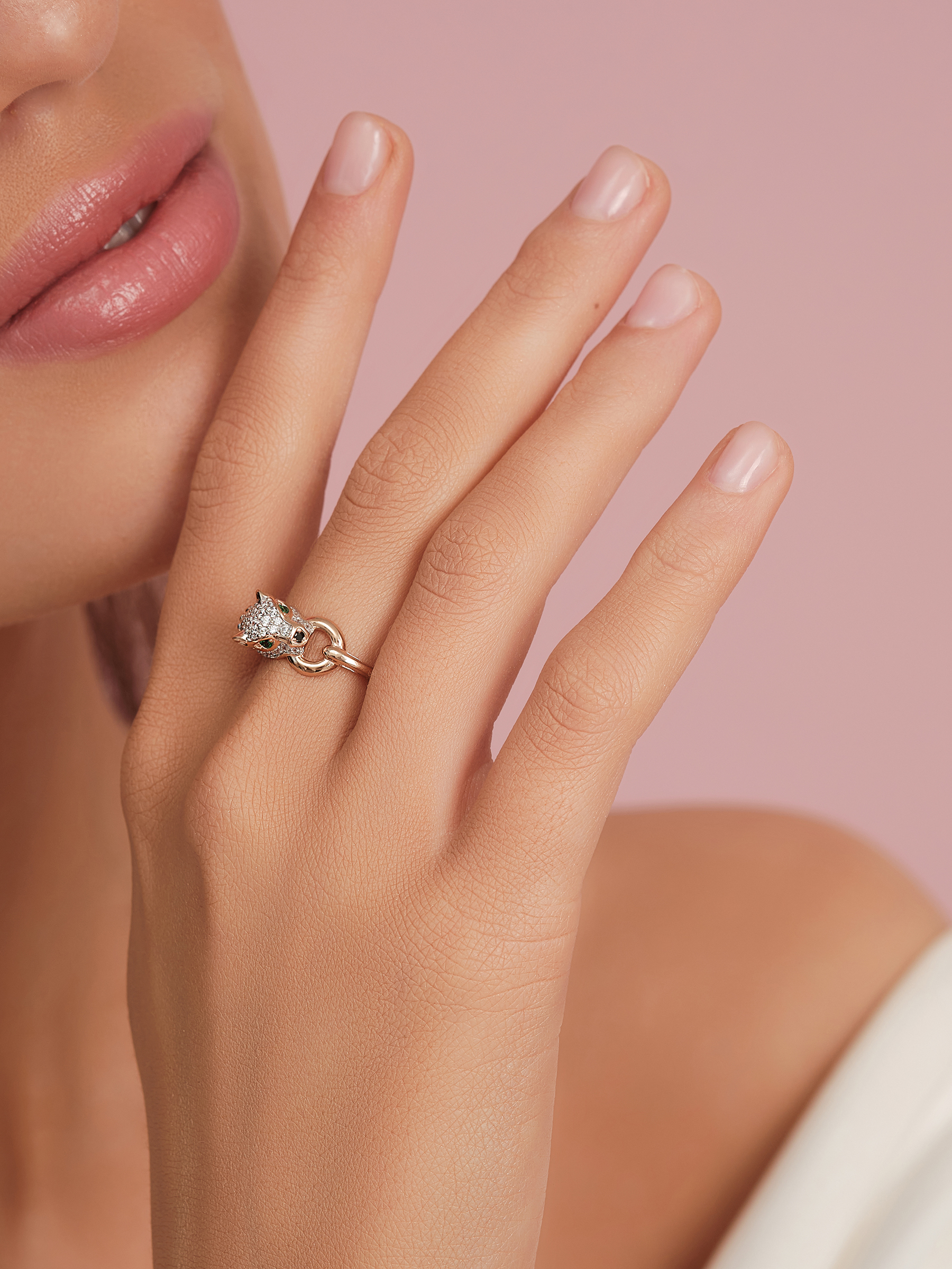 Аннималистичный дизайн кольца, выполненного из золота и цветных фианитов - яркое украшение для яркой девушки. Пума на кольце, исполненная из цветных фианитов, будет говорить о страстной натуре обладательницы.