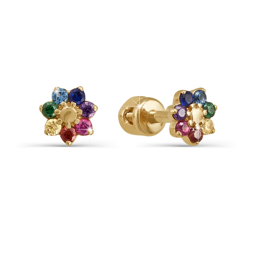 Серьги пусеты из серебра 925 пробы с позолотой, с цветными фианитами